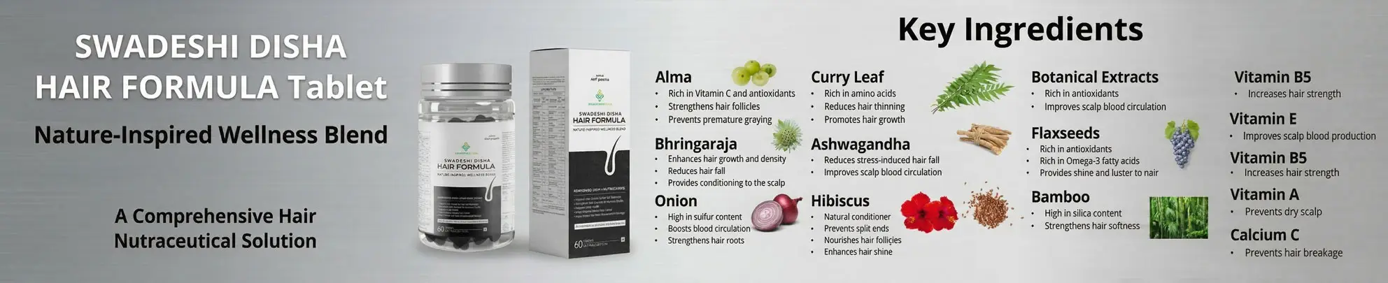 Experience the secret to thick, lustrous, and healthy hair with Swadeshi Disha Hair Formula. This comprehensive nutraceutical supplement is designed to address the root causes of hair concerns—including nutritional deficiencies, hormonal imbalances, and environmental stress—by providing a powerful synergy of 25+ botanical extracts, vitamins, and minerals.