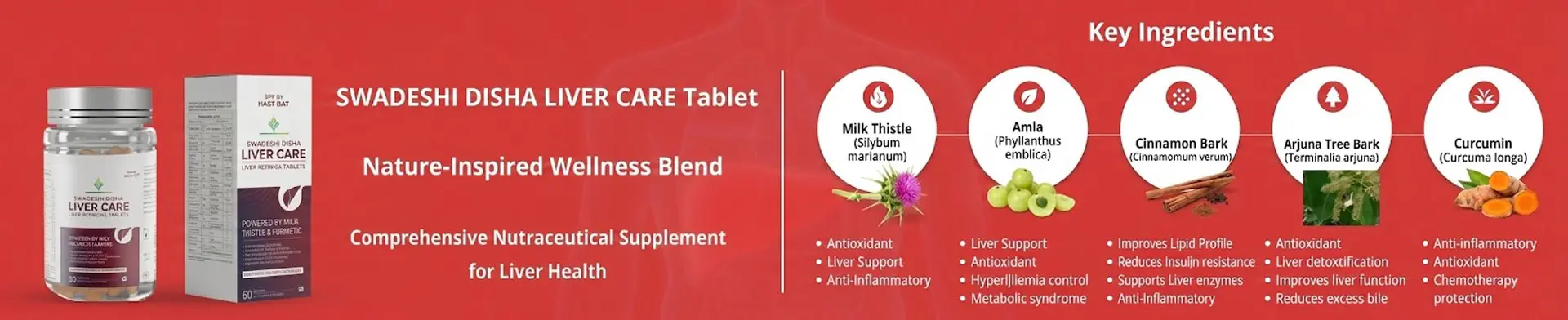 Swadeshi Disha Liver Care is a nature-inspired wellness blend designed to provide complete nutraceutical support for liver health. Formulated with over 18 herbal extracts, minerals, and vitamins, these tablets combine traditional Ayurvedic wisdom with scientific principles to keep your liver healthy and support overall body development.