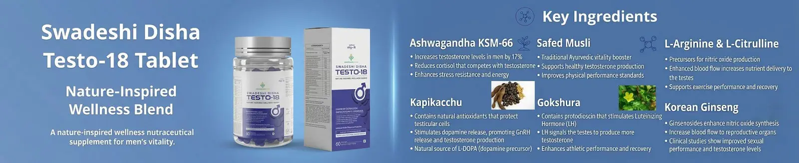 Unlock your body’s full potential with Swadeshi Disha Testo-18, a premium testosterone-boosting nutraceutical designed for the modern man. Formulated with a synergistic blend of traditional Ayurvedic herbs, amino acids, and essential minerals, Testo-18 works naturally to optimize hormonal balance, increase physical strength, and enhance overall stamina.